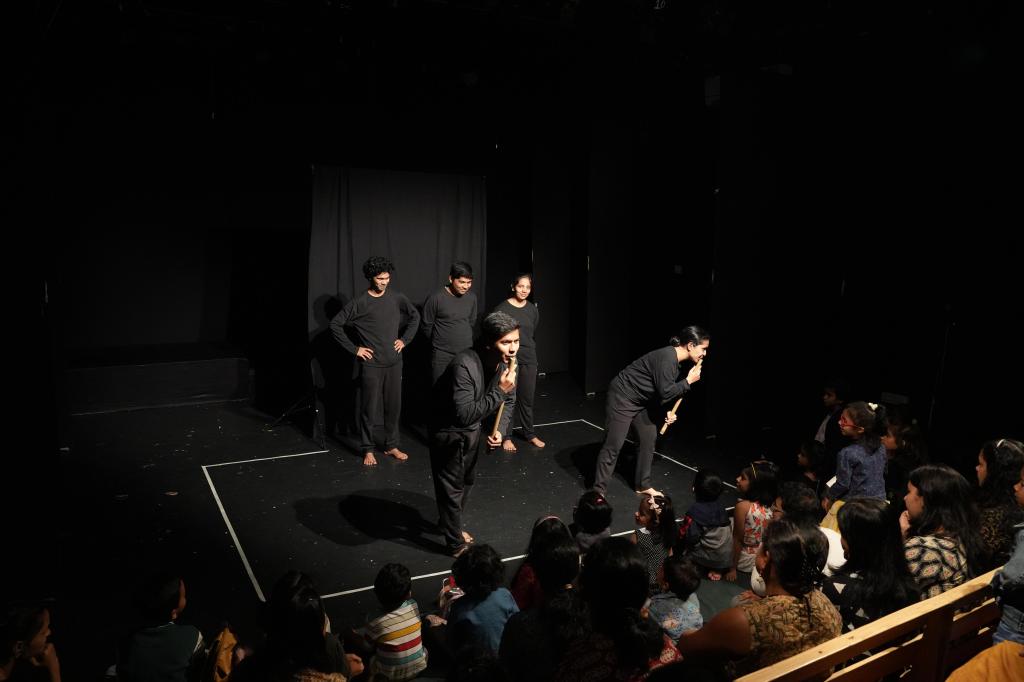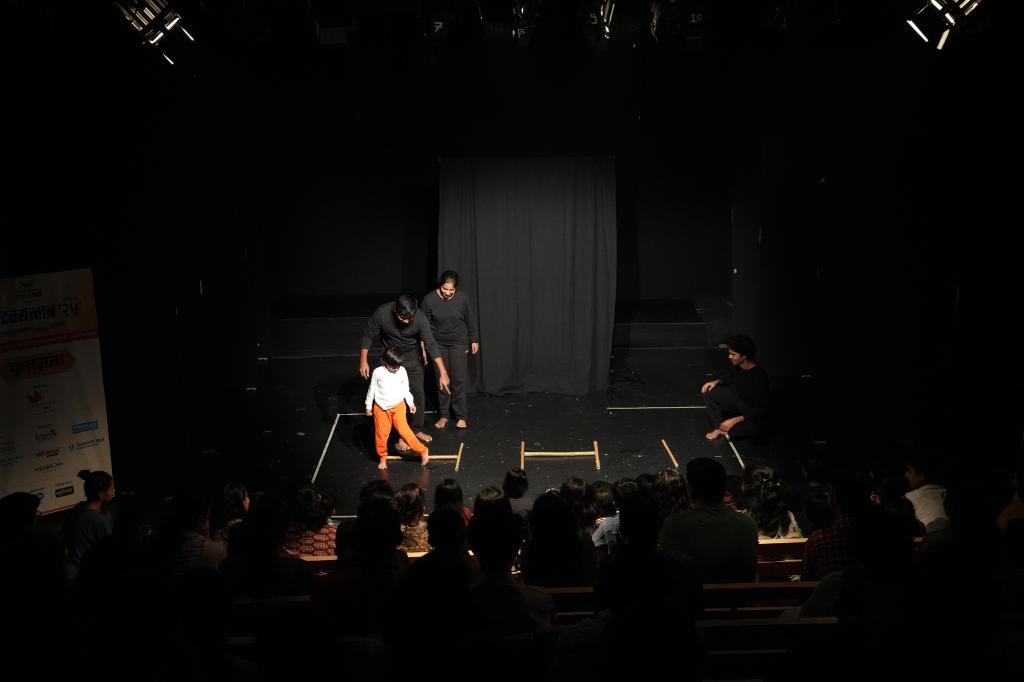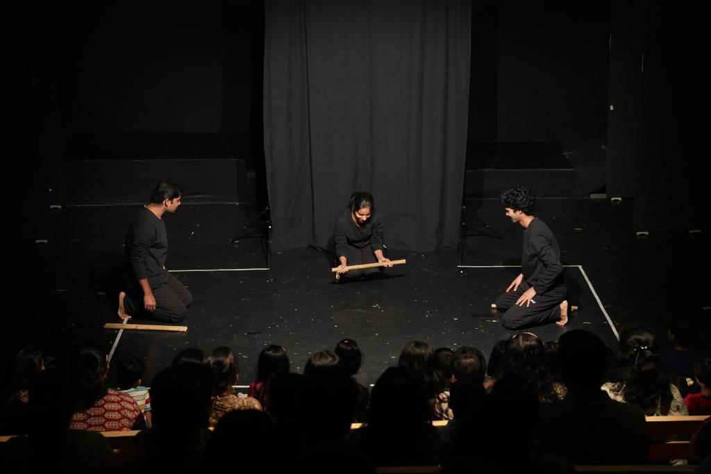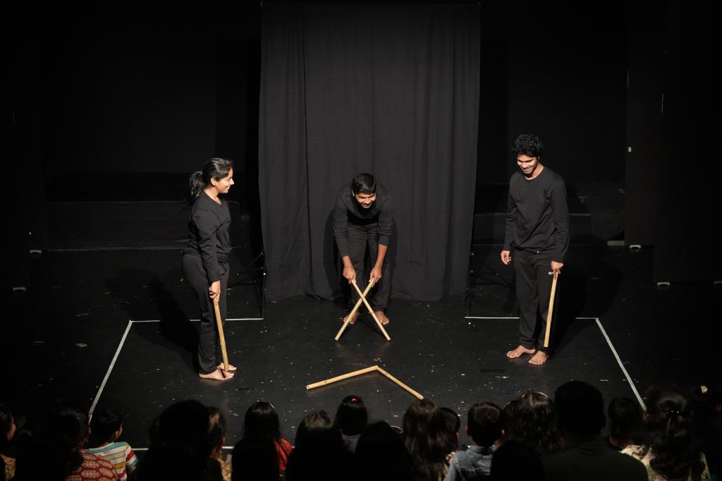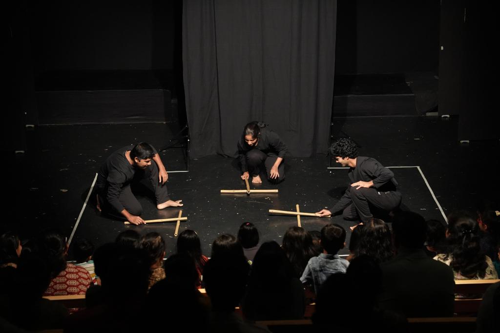 Bamboo is a material that is easily accessible to children in rural areas. In the play ‘Bamboo…!’ Goshtarang fellows use bamboo sticks and strips of various sizes to create imaginative visuals, engage in interactive games, and perform dynamic movements. The play encourages active participation from children, allowing them to explore the versatility of bamboo while immersing themselves in a playful and creative experience.